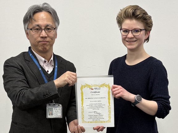 Herr Prof. Yoshida, Gifu University, Japan, überreicht Frau Mrozek eine Bescheinigung für das erfolgreiche Absolvieren ihrer Forschungstätigkeiten im Rahmen des Austauschprogrammes G-CADET