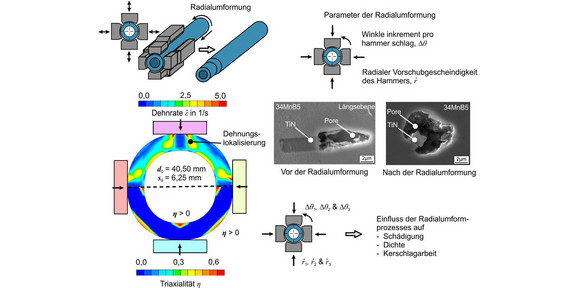 The production of drive shafts is done by means of radial forging, spline extrusion and martensitic hardening. The collaborative transfer project is conducted together with GKN automotive and Hexagon. Radial forging, an incremental forming process, is investigated with the aim of increasing the product properties by controlling the processing parameters. During each hammer stroke of radial forging, the inner and outer surfaces experience an alternating positive and negative triaxiality. The effect of radial forging parameters on change in density, void area fraction and impact energy is investigated. After spline extrusion, the shafts are austenitized, quenched and tempered to obtain a tough martensitic shaft. Even after martensitic hardening, the effect of radial forging parameters on the lifetime of the shafts is visible. Hence the aim of the project is to manufacture hollow tubular shafts using a damage-controlled process route.