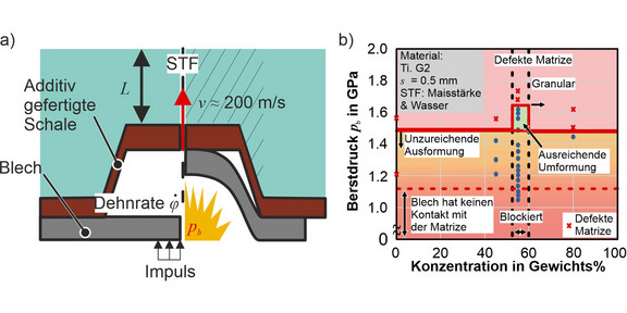 The focus of the project is on increasing the flexibility of the vaporization vaporizing foil actuator forming process for small batch production. In this process, massive, inflexible steel dies are replaced by thin, flexible, additively manufactured shells, which are suitable for unique part geometries. These shells are supported by shear-thickening fluids (STF). The fluid is initially liquid and solidifies instantaneously under the high strain rates caused by the impact of the workpiece. The fluid fill level has no influence on the forming result, where even a 5 mm layer is sufficient to stabilize the die. However, the concentration of the STF significantly affects the forming result and must be selected to ensure instant solidification. Numerically, the vaporization process can be modelled through a pressure amplitude with an enlarged pressure surface. The STF is represented by an equation of state and corresponding viscosity, enabling the design of the die to withstand the impact of the workpiece.