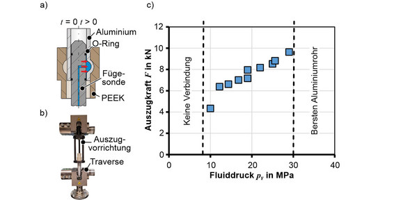 Im Projekt AutoFit untersuchte das IUL gemeinsam mit Partnern das kraft- und formschlüssige Fügen von Aluminiumrohren mit PEEK-Bauteilen für den Einsatz im Kraftstoffsystem kommerzieller Flugzeuge. Im Fokus standen die numerische und experimentelle Prozessauslegung des elektromagnetischen Fügens (EMF) und des Innenhochdruckfügens (IHF). Aufgrund des spröden Materialverhaltens von PEEK bei hohen Dehnraten erwies sich EMF als ungeeignet, während mit dem quasi-statischen IHF belastbare Verbindungen hergestellt werden konnten. Diese wurden in Zugversuchen geprüft und ihre maximale Tragfähigkeit bestimmt. Zudem entstand im Projekt eine automatisierte Bestückungszelle, die erfolgreich im Labor getestet wurde. Die Ergebnisse zeigen großes Potenzial für Effizienz, Qualität und Wirtschaftlichkeit. Die digitale Erfassung von Prozessparametern verbessert Nachverfolgbarkeit und Qualitätssicherung. Ergänzend wurden zerstörungsfreie Inline-Prüfverfahren weiterentwickelt, um Durchlaufzeiten sowie Material- und Personalkosten zu reduzieren und gleichzeitig Umwelt- und Gesundheitsrisiken zu senken.
